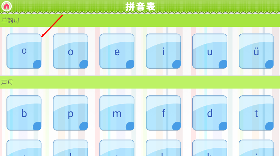 2、在学习页面中,从拼音表开始选择学习内容,可查看声母、韵母及整体认读音节。