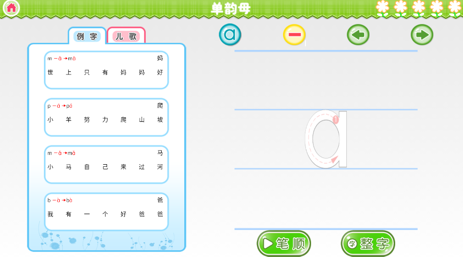 支持声母、韵母、整体认读音节分段学习,配合发音播放与拼读练习,帮助建立标准语音体系。
