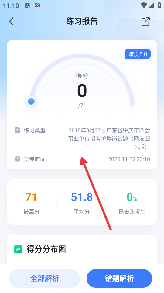 4、答题结束后,可查看【练习报告】,了解得分、练习类型、交卷时间等信息,还可查看全部解析或错题解析。