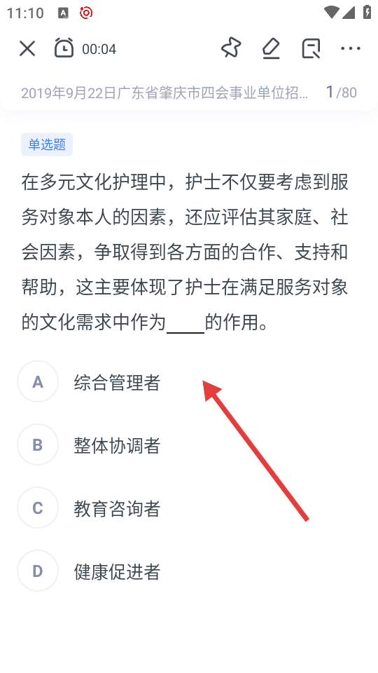 3、进入试卷后,可进行单选题等题型的作答,如面对多元文化护理相关题目,可根据知识储备选择答案。