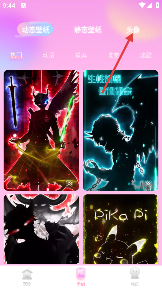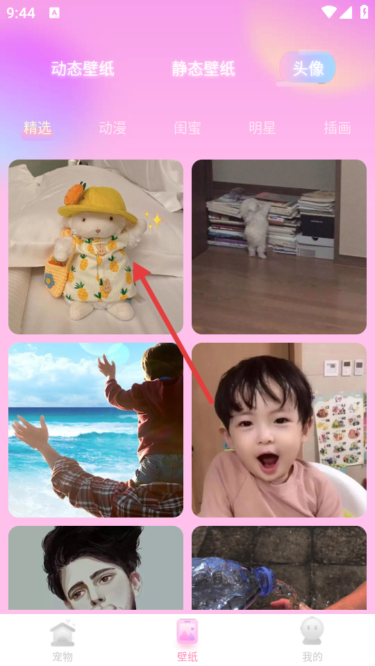 2、在壁纸页面,点击【头像】分类,可查看精选、动漫、闺蜜等不同风格的头像内容。
