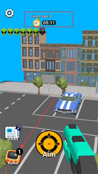 1、进入游戏后,查看左上角的外星人数量,通过瞄准镜锁定外星人目标,点击“Shoot”按钮射击,消灭外星人,完成关卡目标。