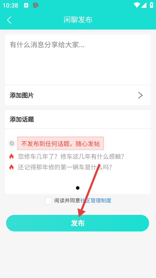 4、在闲聊发布页面,输入分享内容,可添加图片、话题等,点击【发布】即可发布闲聊帖。