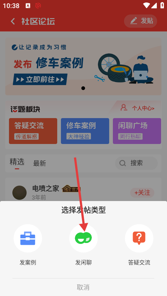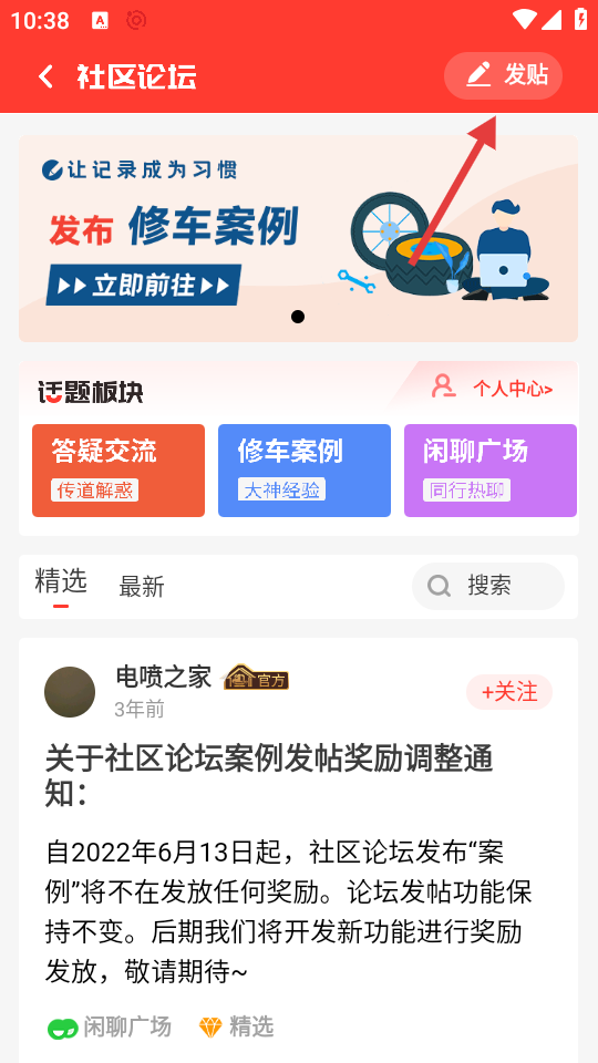 2、在社区论坛页面,点击右上角【发帖】按钮,可选择发帖类型。