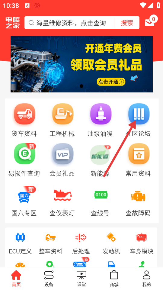 1、在首页点击【社区论坛】图标,进入社区论坛页面,可参与各类话题讨论。