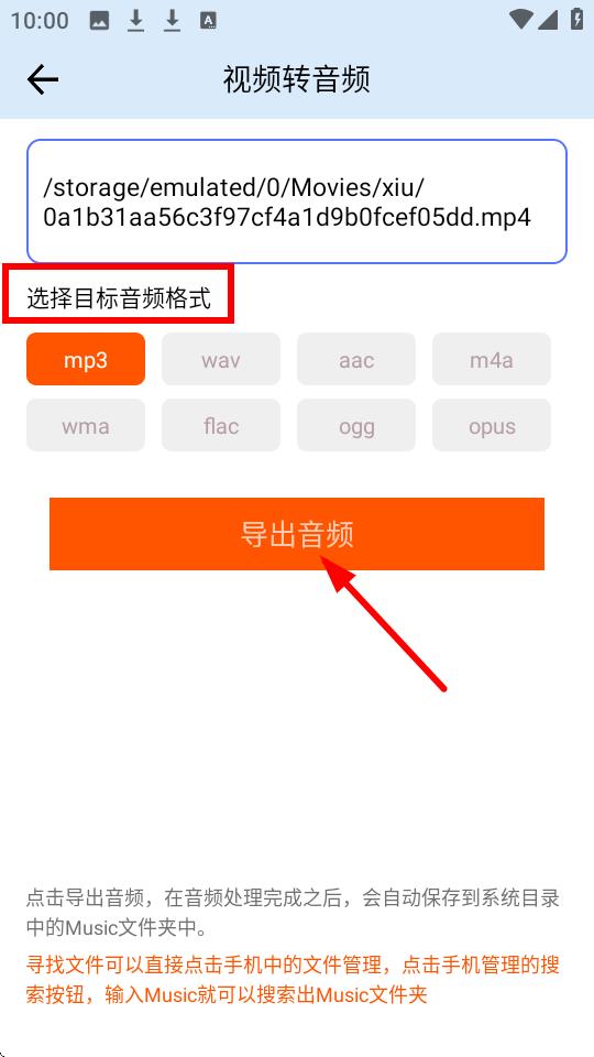 4、在【视频转音频】界面,先【选择目标音频格式】,再点击【导出音频】即可完成转换。