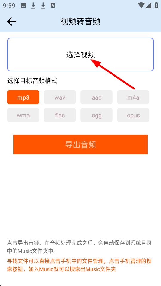 2、在【视频转音频】界面,点击【选择视频】按钮,即可进入文件夹选择要转换的视频。