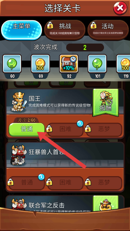 1、在选择关卡界面,点击【普通】难度按钮,进入对应关卡开始游戏。