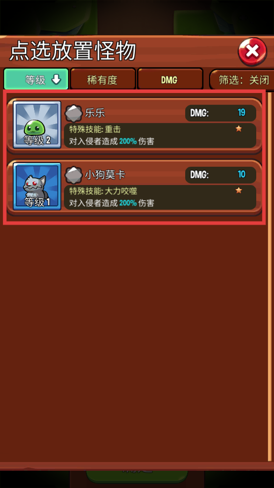 2、在怪物选择界面,挑选合适的怪物(如等级2的乐乐、等级1的小狗莫卡),根据其技能和伤害属性进行选择。