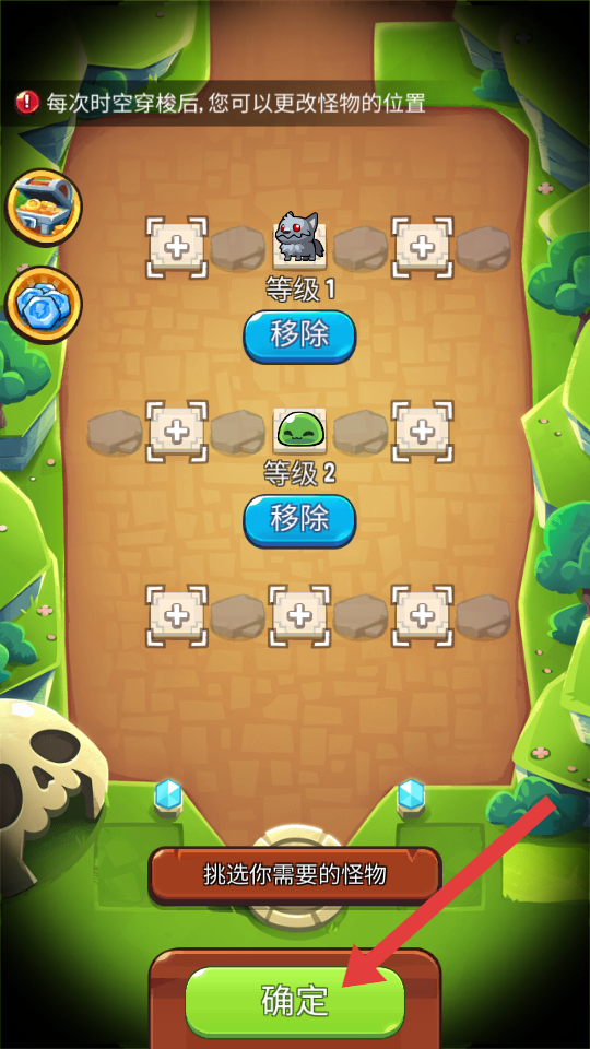 3、将选择的怪物放置到场景中的对应位置后,点击【确定】按钮,确认怪物布局,开始关卡挑战。