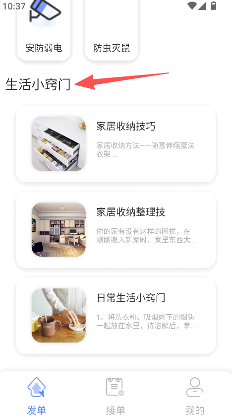 2、板块功能明确,“发单”“接单”聚焦维修业务流转,“生活小窍门”专注生活知识传递,功能分区清晰,用户使用时目标明确。