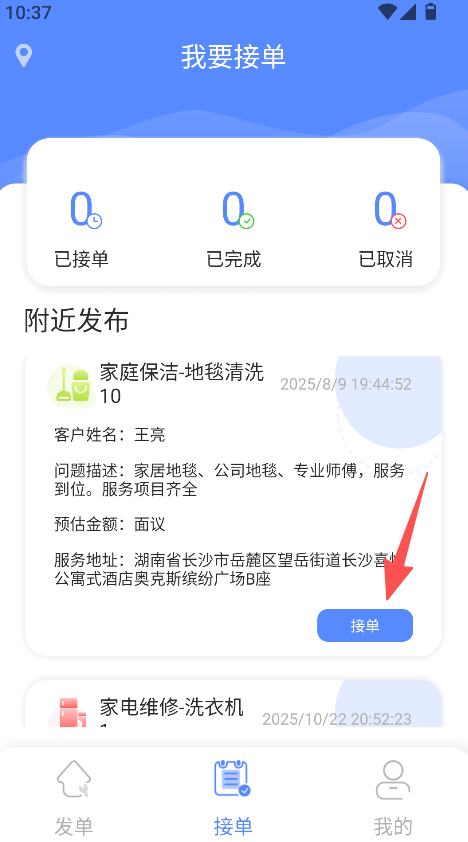 3、浏览附近维修订单(如家庭保洁-地毯清洗),选择合适订单点击接单。