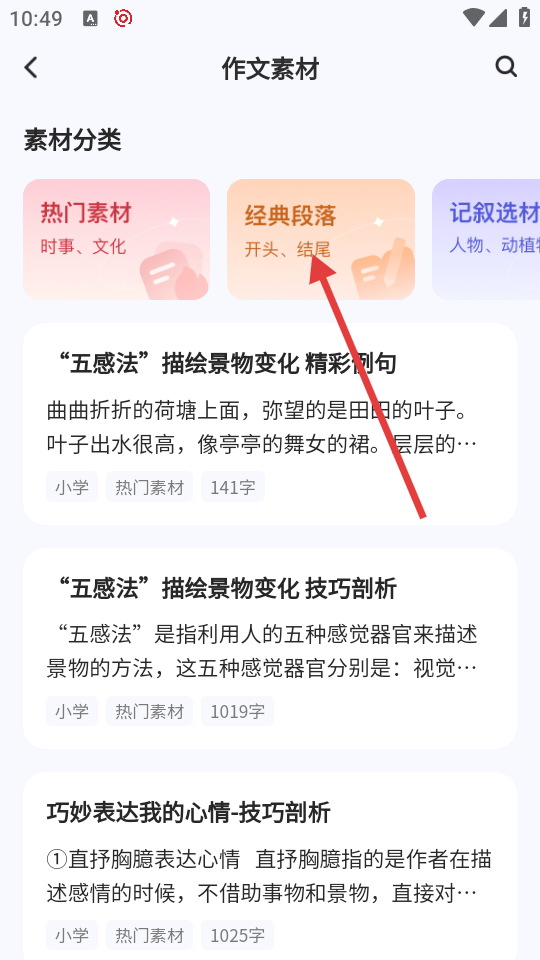2、在作文素材页面,点击【经典段落】分类,可查看开头、结尾等不同类型的经典段落素材。
