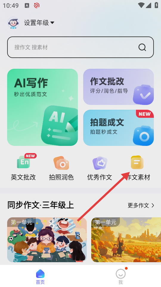 1、在首页点击【作文素材】图标,进入作文素材页面,可查看各类素材分类。
