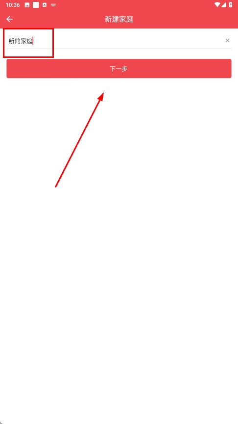 4、在新建家庭页面,输入家庭名称后点击【下一步-功能按钮】,继续家庭创建。