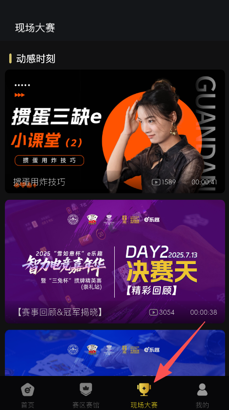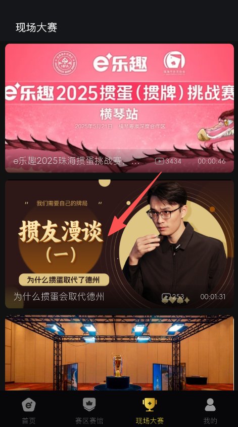 1、进入现场大赛板块,可观看掼蛋小课堂、赛事回顾、掼友漫谈等视频。