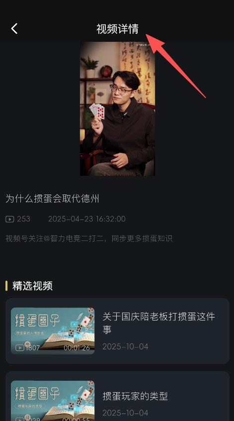 2、支持视频详情查看功能,点击视频可查看发布时间、简介及精选视频推荐,方便用户深入了解内容并发现更多相关掼蛋视频。