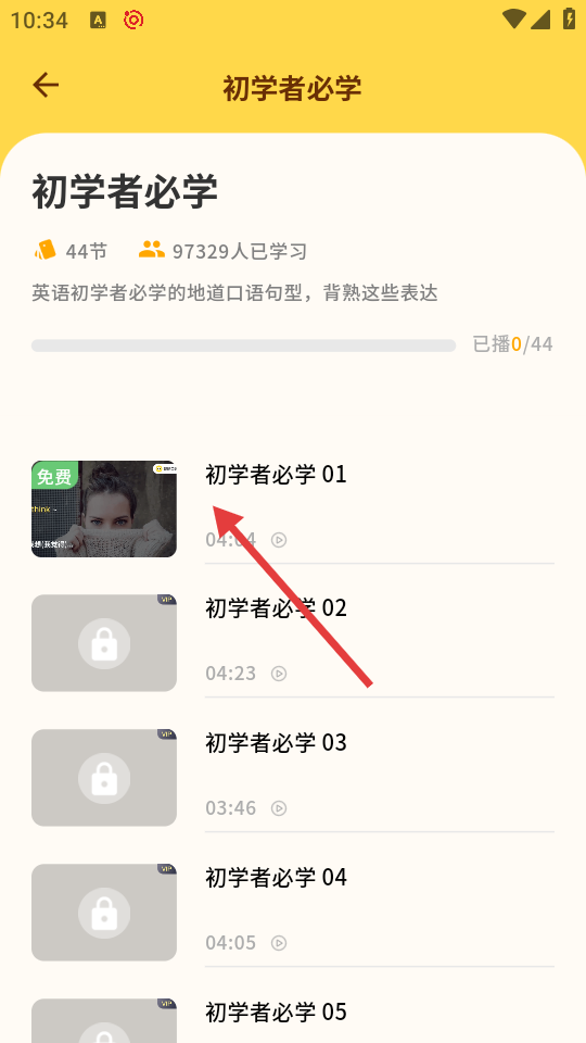 4、在课程详情页,点击【初学者必学01】,即可开始学习该节课程内容。
