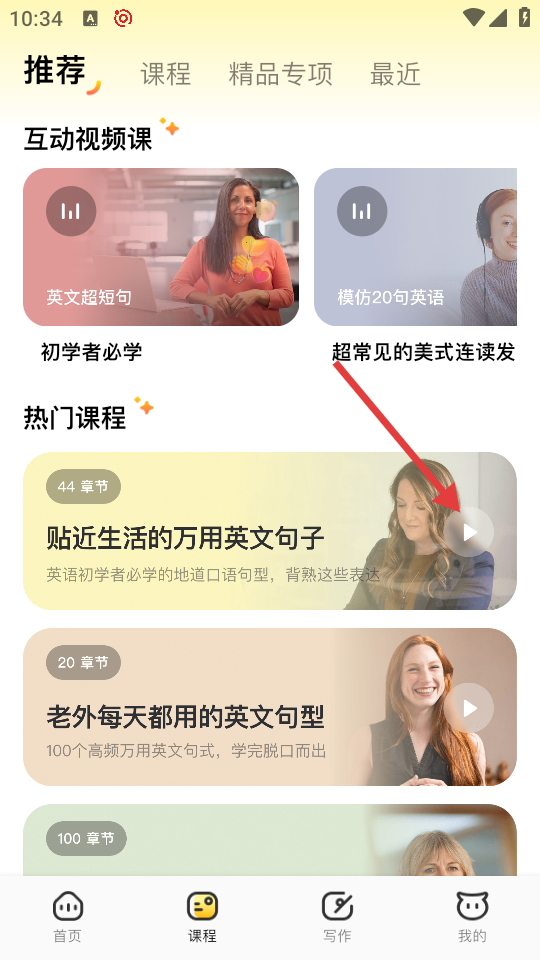 3、在课程推荐页面,选择感兴趣的课程,如【贴近生活的万用英文句子】,点击进入课程详情页。