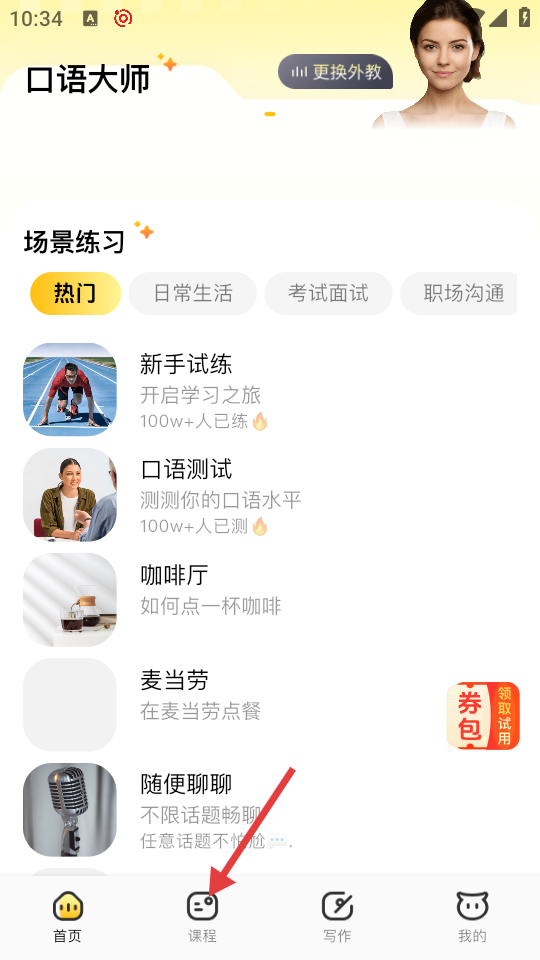 2、在主界面点击底部【课程】选项,进入课程推荐页面,可查看互动视频课、热门课程等内容。