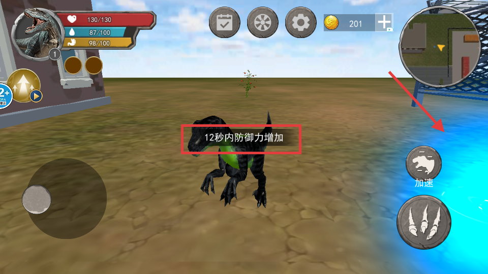 3、触发【12秒内防御力增加】的buff后,点击【加速】快速移动,高效应对野兽或开展狩猎。
