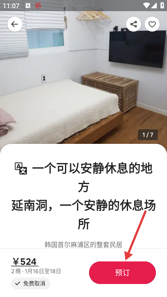3、在房源详情页,点击【预订】按钮,进入预订确认页面。