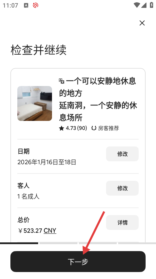 4、在预订确认页面,检查房源、日期、客人及总价等信息后,点击【下一步】,可继续完成预订流程。