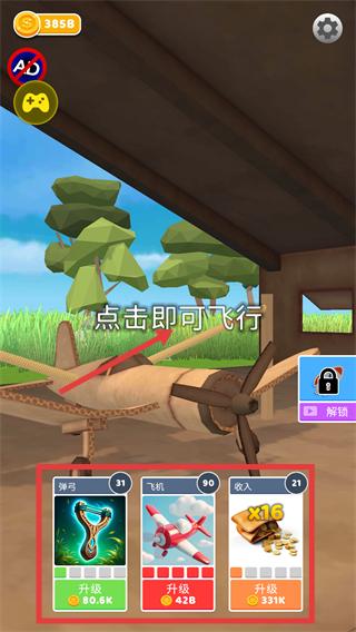 1、可升级【弹弓】【飞机】【收入】等模块,消耗金币提升属性,升级完成后轻触屏幕让飞机沿跑道起飞,开始飞行挑战。