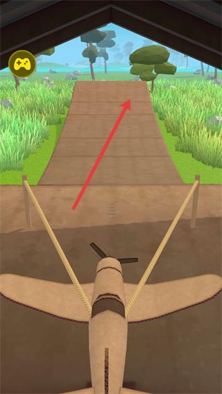 3、沿跑道方向操控飞机弹射起飞,借助弹弓助力保持飞行轨迹稳定,向更远区域推进。