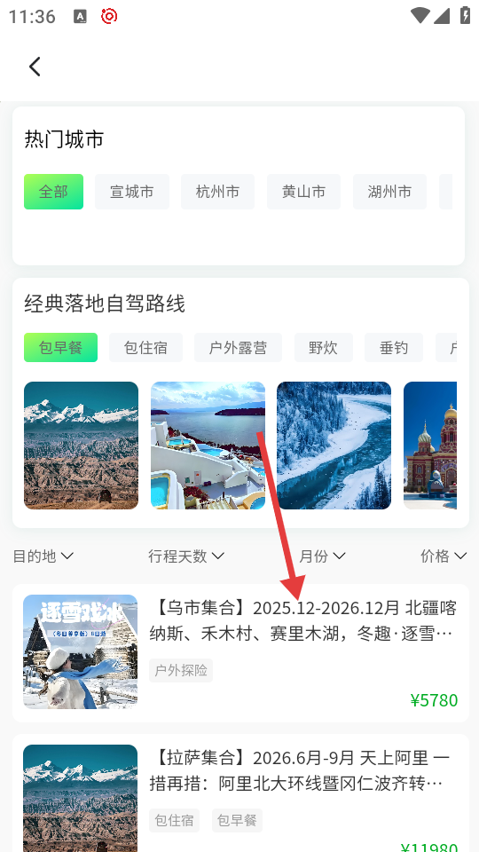 2、在落地自驾页面,选择感兴趣的路线,点击进入路线详情页。