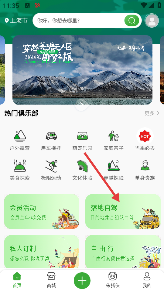 1、点击【落地自驾】选项,进入落地自驾页面,可查看热门城市和经典落地自驾路线。