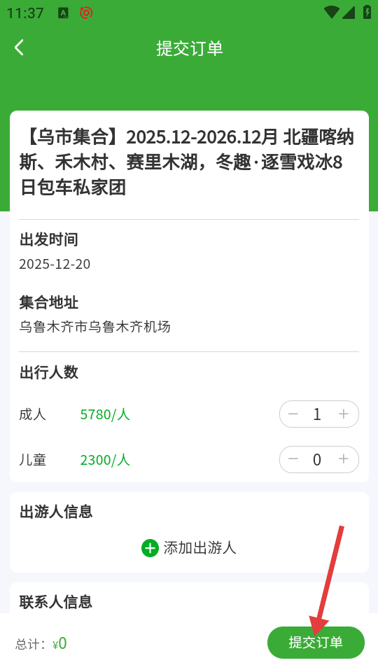 4、在提交订单页面,确认出发时间、集合地址、出行人数等信息后,点击【提交订单】,即可完成报名流程。