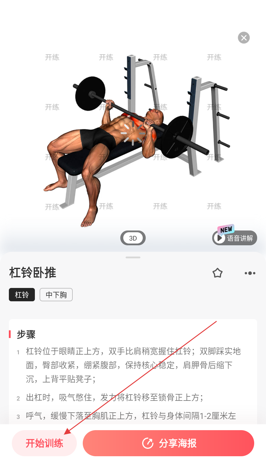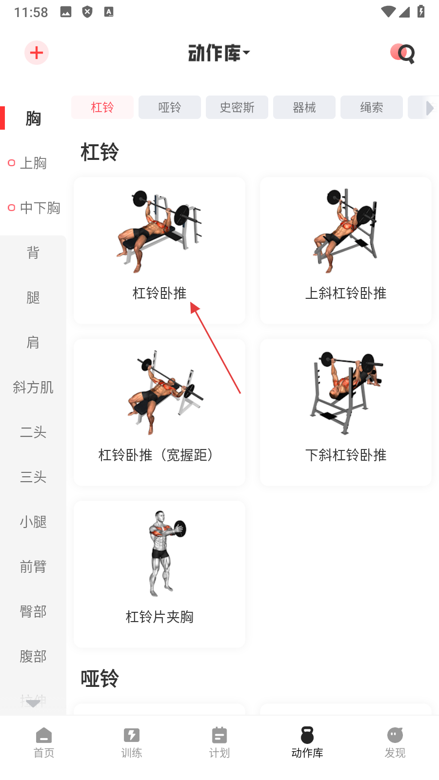 2、在动作库页面,点击【杠铃卧推】,进入动作详情页面。