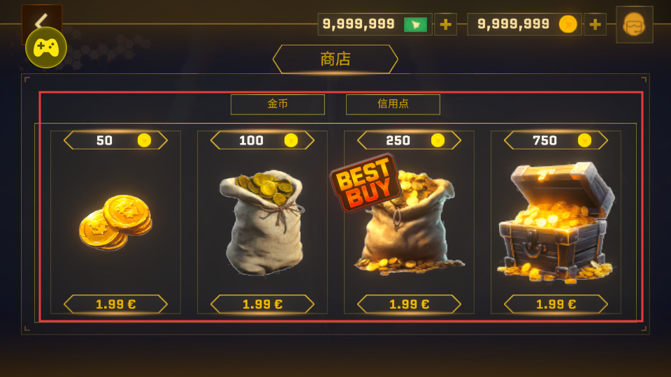 1、在商店界面,可使用金币或信用点购买不同额度的金币包,积累资源用于解锁战机、升级装备等,提升空战能力。