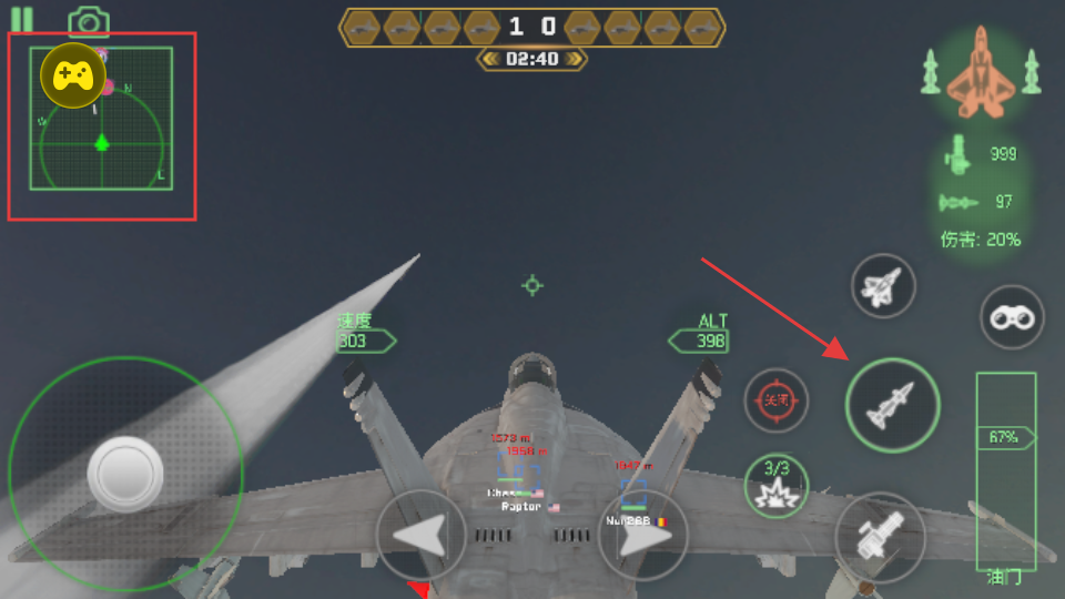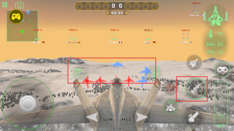 3、利用左上角雷达地图掌握战场局势,追踪敌方位置,合理规划战机移动路线,同时关注战机速度、高度等参数,调整战斗策略。