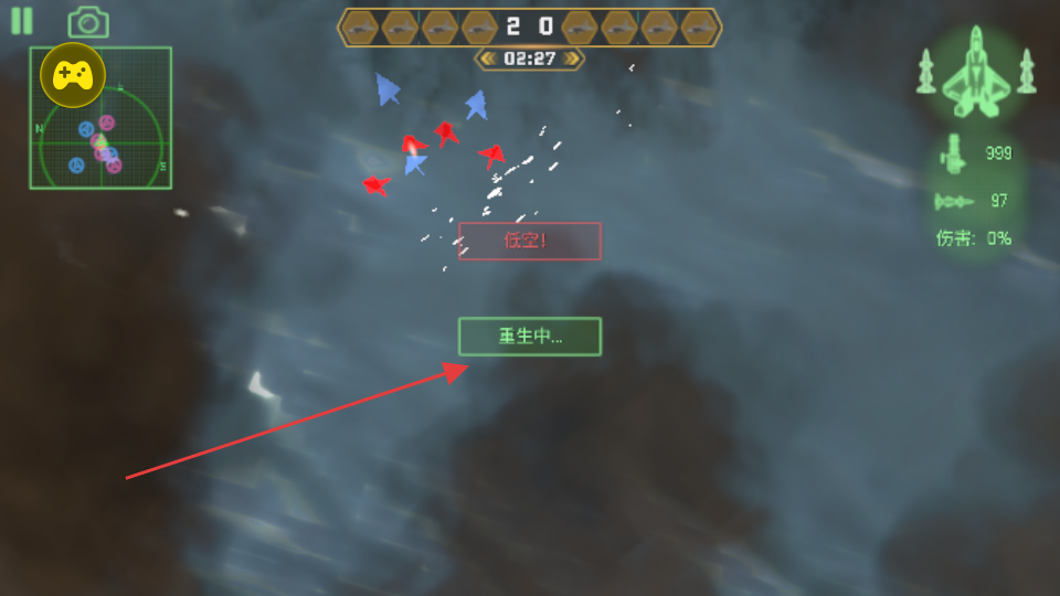 4、若战机被击毁,可等待“重生中”状态结束后重新加入战斗,继续参与空战对决,不断提升驾驶和战斗技巧,争取在空战中取得优势。