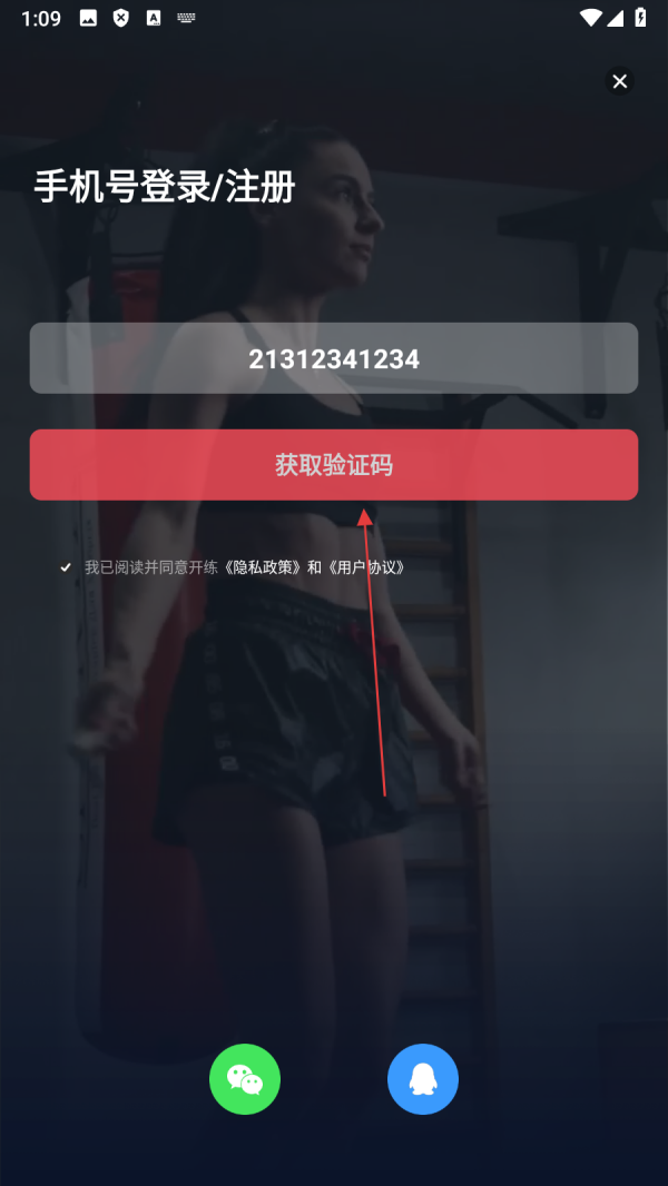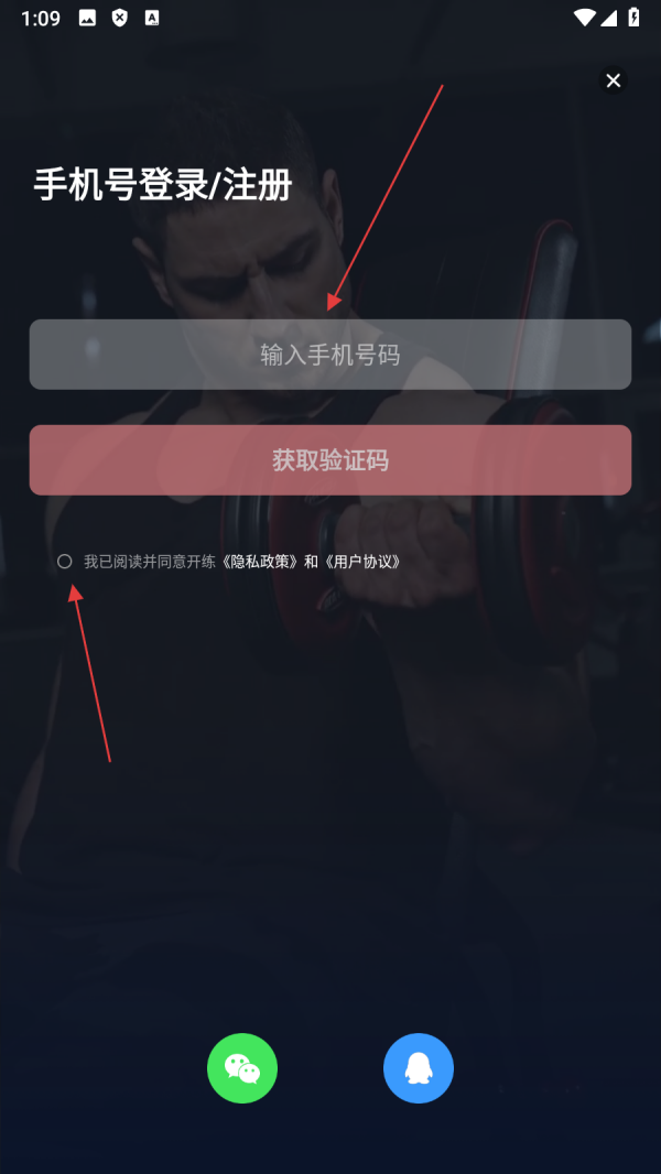 3、在手机号登录/注册页面,输入【手机号并勾选协议】。