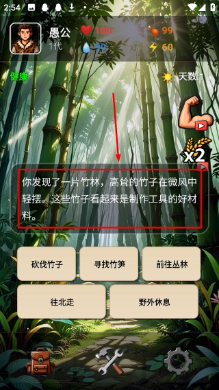 1、进入竹林后,确认【竹子】是制作工具的好材料,可选择【砍伐竹子】或寻找竹笋等操作推进进度。
