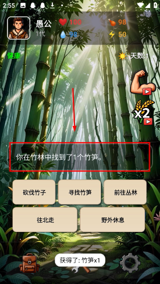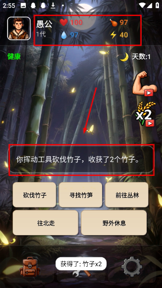 3、挥动工具砍伐【竹子】,成功收获【竹子】×2,同时留意健康等状态数值的变化情况。