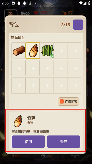 4、打开【背包】查看【竹笋】,其作为食物可恢复15饱食度,按需选择使用或丢弃操作调整状态。