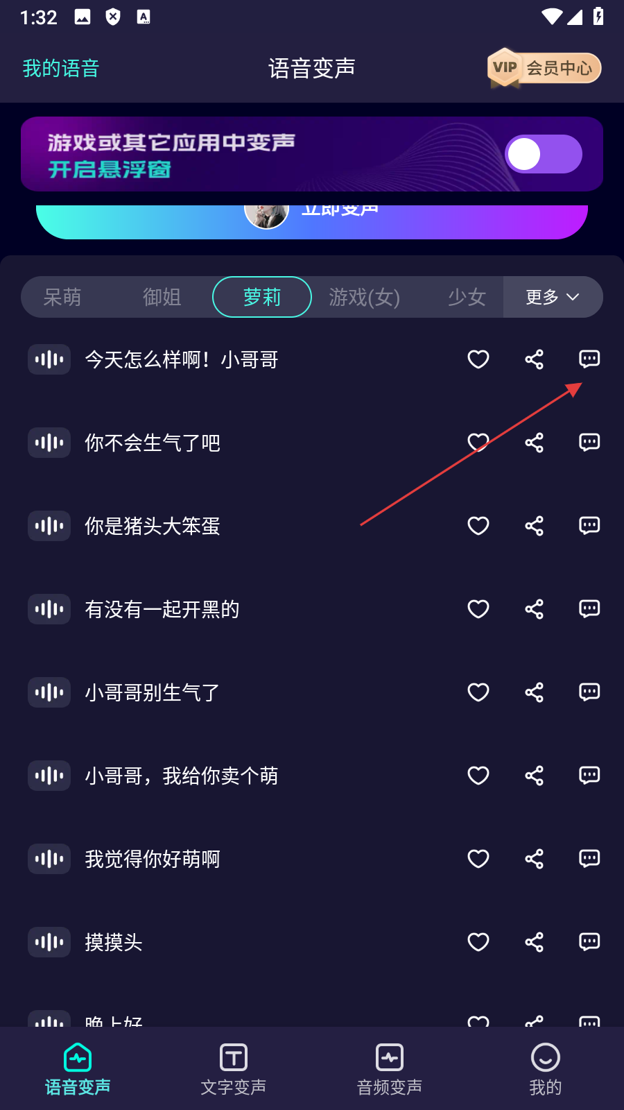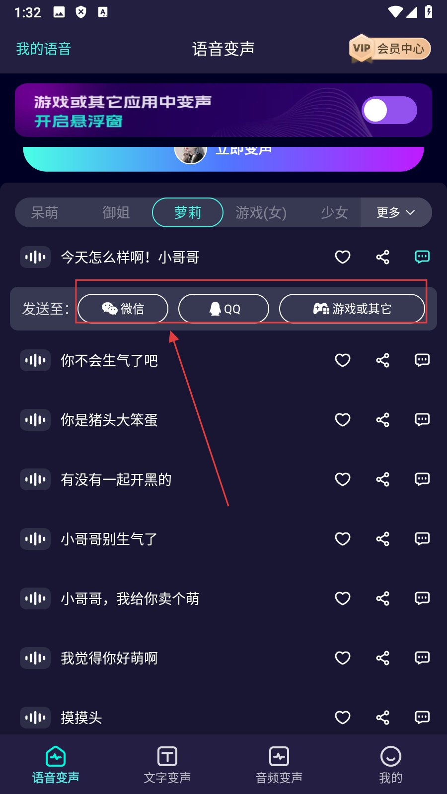 3、在萝莉语音类型页面,点击【目标语音的聊天图标】,弹出发送选项。