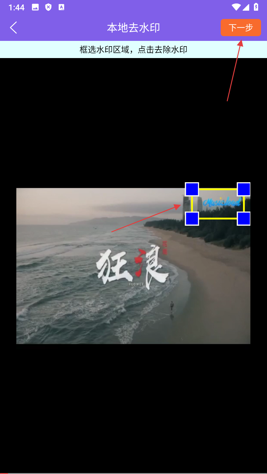 3、在本地去水印页面【框选水印区域】后点击【下一步】,进入预览效果页面。