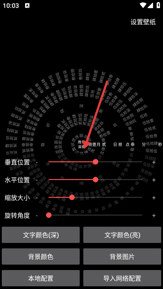 4、在【设置壁纸】界面,可调整时间轮盘的垂直位置、水平位置等参数,还可设置文字颜色、背景颜色、背景图片等。