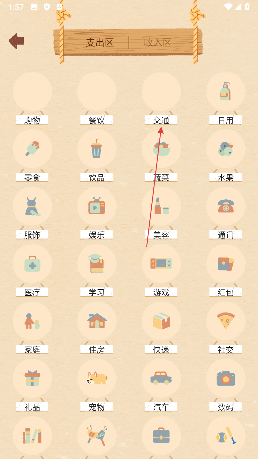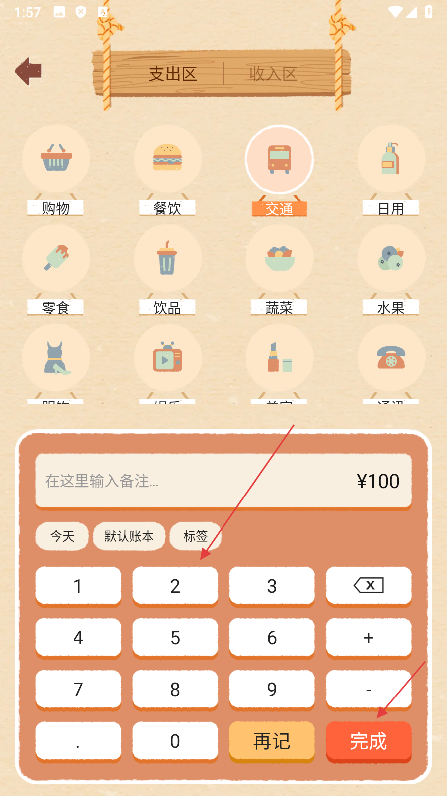 2、在记账分类页面,点击【交通】,进入金额输入页面。