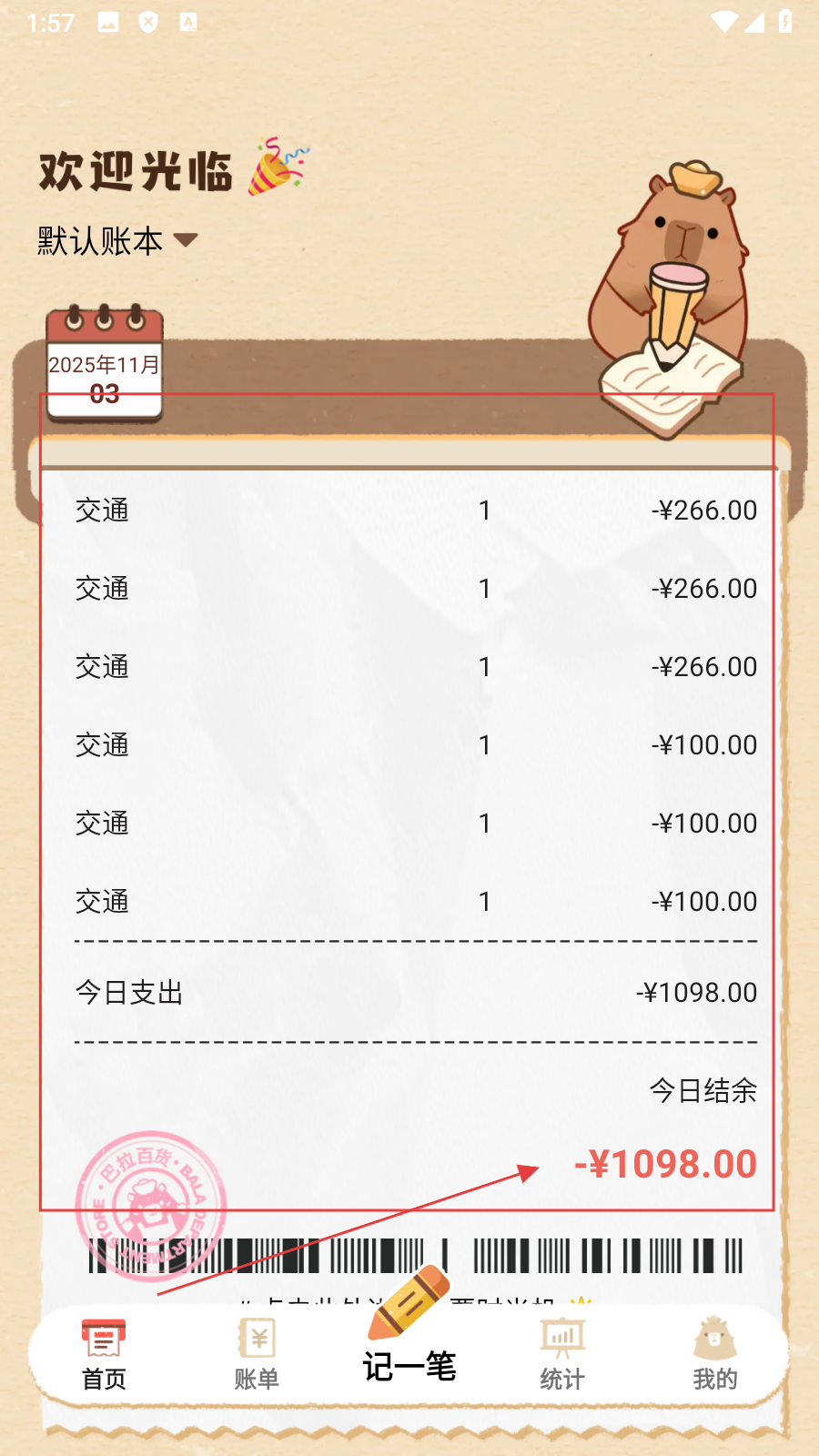 4、自动返回首页,即可查看【今日支出等记账明细】。