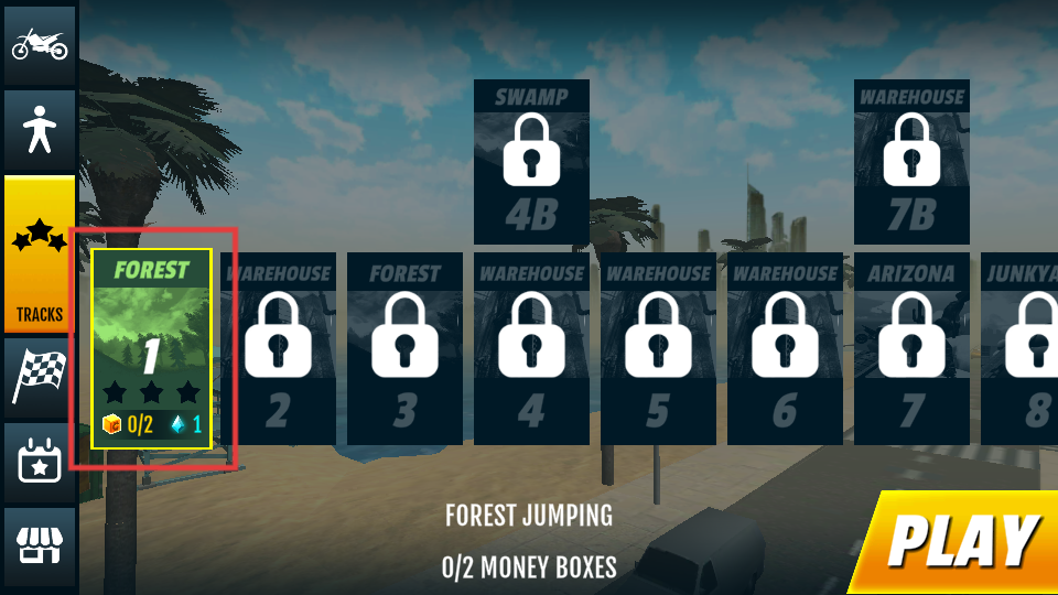 1、选择摩托车后点击【PLAY】,进入游戏开始摩托越野挑战。