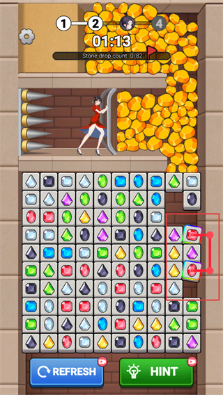 1、在宝石消除场景中,通过消除右侧带有红色标记的宝石,触发连锁反应,清理宝石堆,为上方的金币和角色腾出空间。