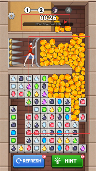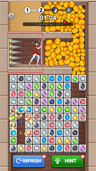 3、持续消除宝石,使金币和石块掉落,填充下方区域,推进进度,争取在时间结束前完成更多进度。