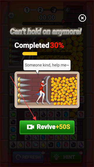 4、若时间耗尽任务未完成,可选择“Revive+50S”复活并获得额外时间,继续消除宝石,完成关卡目标,提升游戏进度。