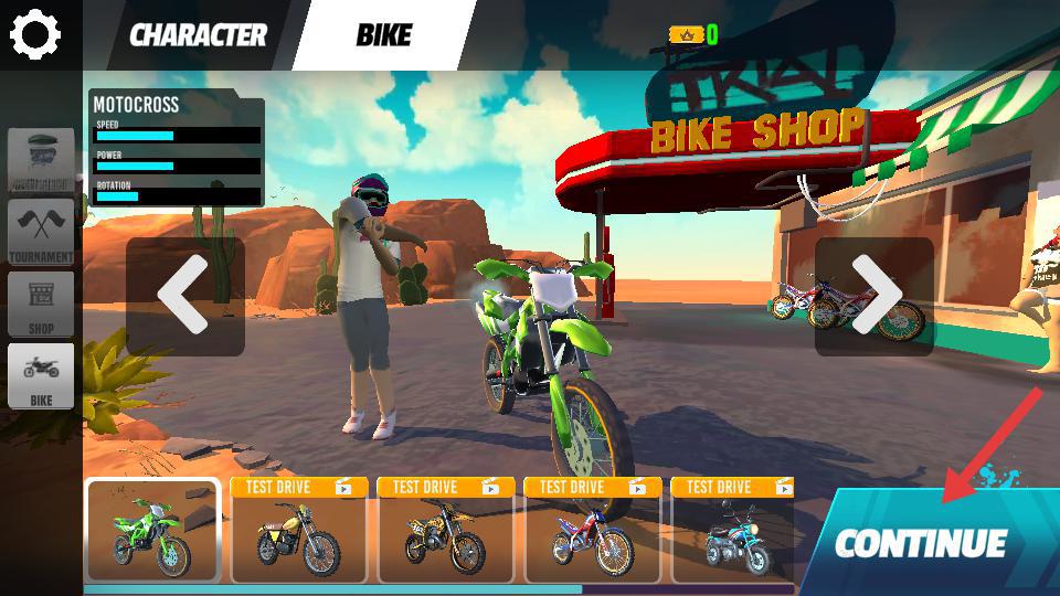 1、点击【CONTINUE】,进入游戏,开启摩托车特技冒险之旅。